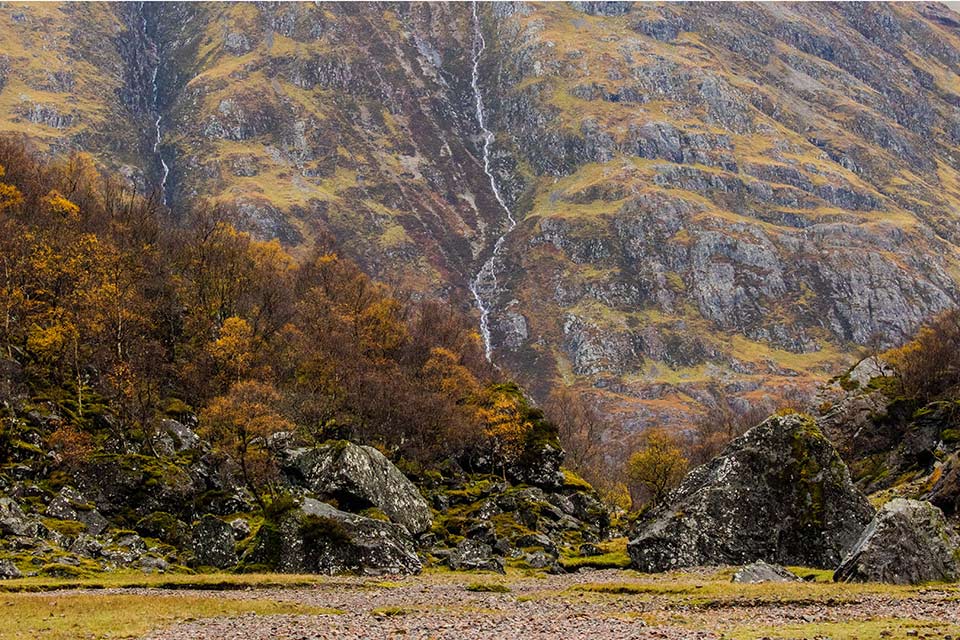 I have done many really wonderful walks, but probably one of the best is one I have done twice, up into the Lost Valley of Glencoe. From there, it goes onward to the peak of Bidean Nam Bian and then descends back over Stob Coire Nan Lochan and its valley, down into Glencoe. The first time was in a blizzard, and we really didn’t see much, but it was a very wild and wonderful experience. The second time was a gentler walk but one which was better visually as we could see the mountains all around us and enjoy Scotland dressed in its finest autumn colours and flavours.