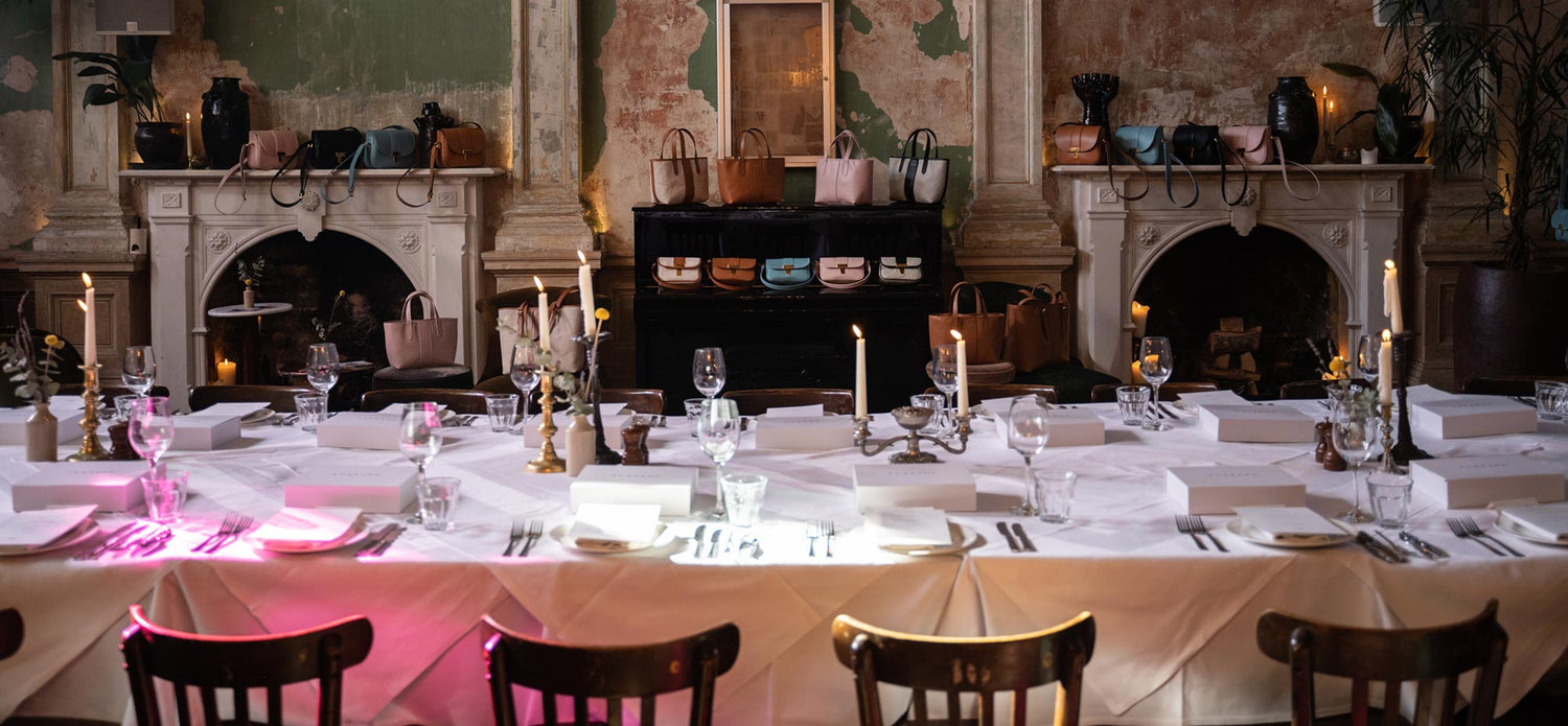 The restaurant and gallery space, founded by Johnny Gent and Russell Potter, is situated in Old Sessions House in London’s Clerkenwell area. The spectacular, carefully distressed interiors of the former courthouse, along with ever-changing art installations and Knight’s seasonal kitchen delights, have made Sessions Arts Club a food-lovers hot spot since opening in 2021. It was the perfect backdrop to preview our bags.