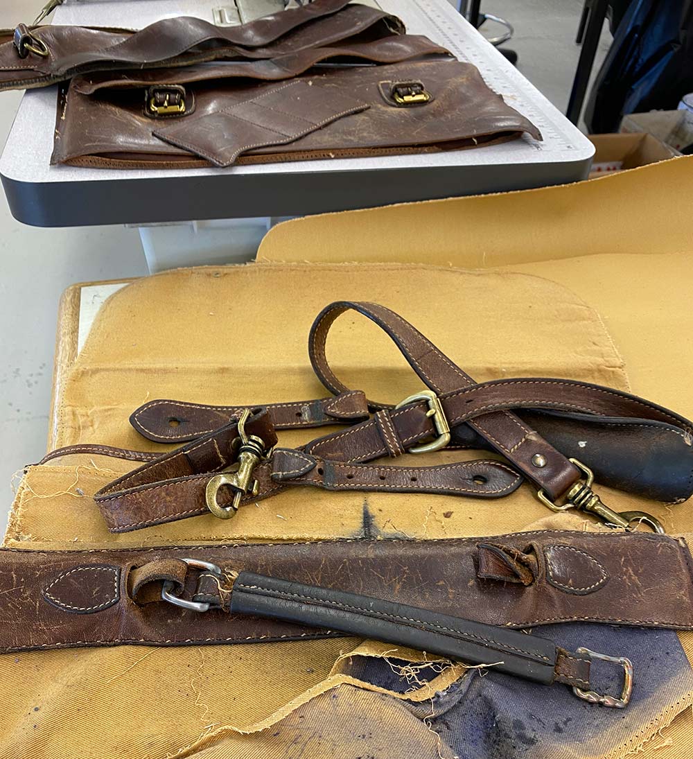 [Photo: Olly’s bag in bits when it came back to the Tusting workshop many years later, in 2021, for refurbishment. Briefcase repairs usually require the bag to be stripped down completely and built back up with new fittings, panels and trimmings, according to the individual requirements for each bag.]