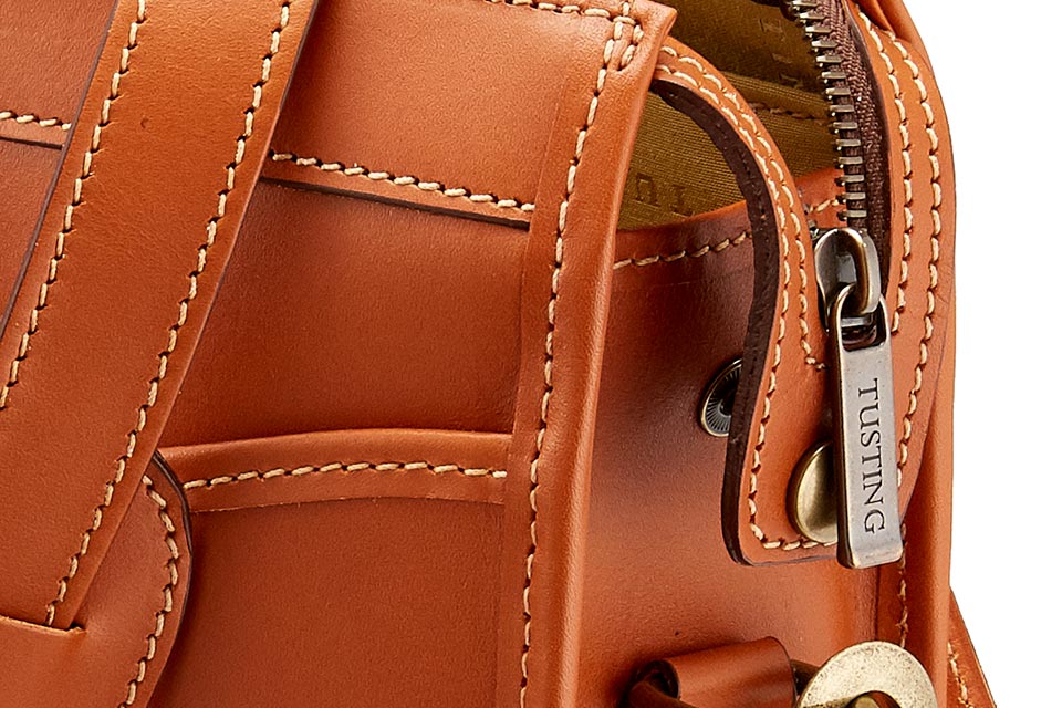 The main body of the bag is secured by a strong swiss zip (we only use Riri zips – the Rolls Royce of zippers) with tabs that can be snapped down onto the bag for a nice clean finish. And everything is stitched down strongly to withstand a very busy life. Further, our construction method for the Marston is such that the parts most likely to show wear through a busy life can be repaired – the handles, binding, zip and metal fittings can all be replaced if a Marston needs an overhaul down the line.