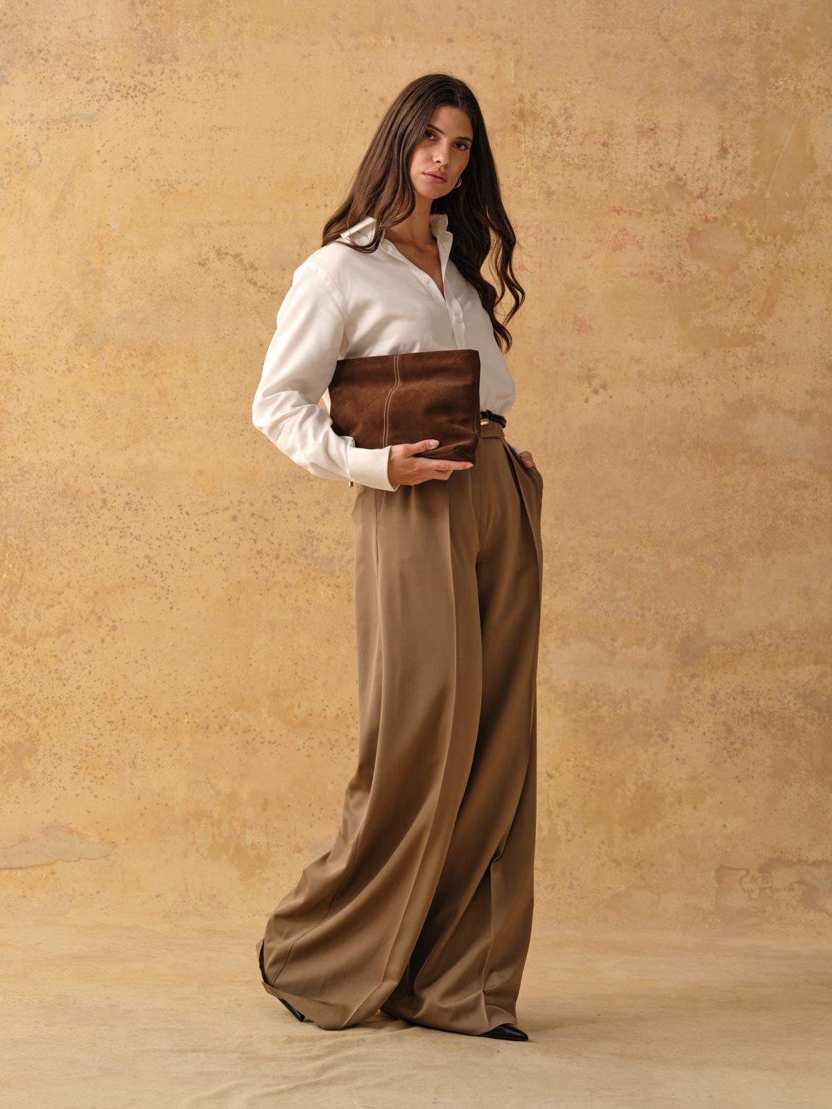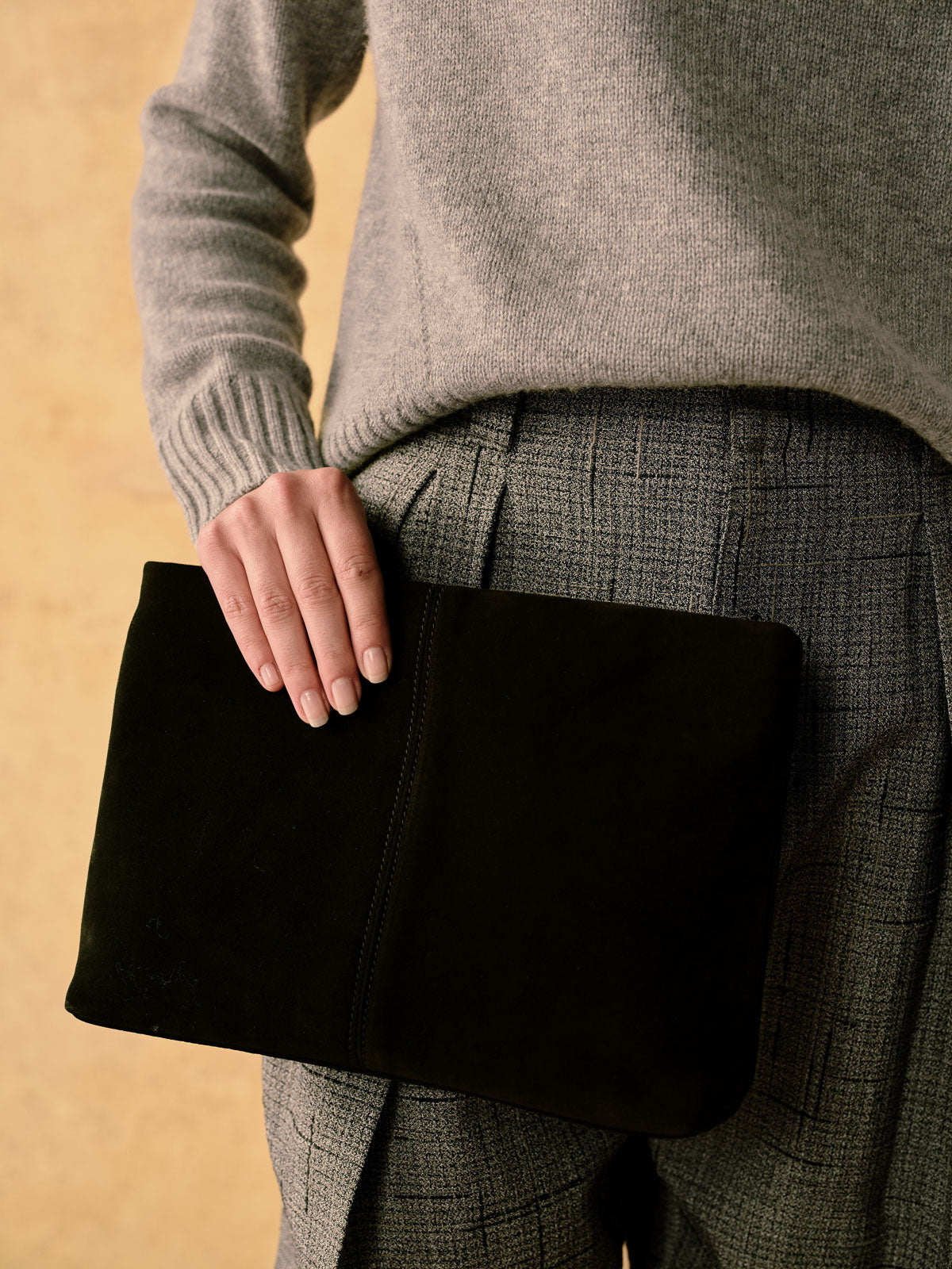 Combining clean lines and structured softness, the Alice clutch is handmade from a choice of premium Italian suede. Lined in Tusting’s signature jacquard, with an internal zip pocket for organisation. A deeply set zip closure creates a smooth outline to accentuate the elegant silhouette of this clutch. Slide it into the Alice tote for coordinated organisation.