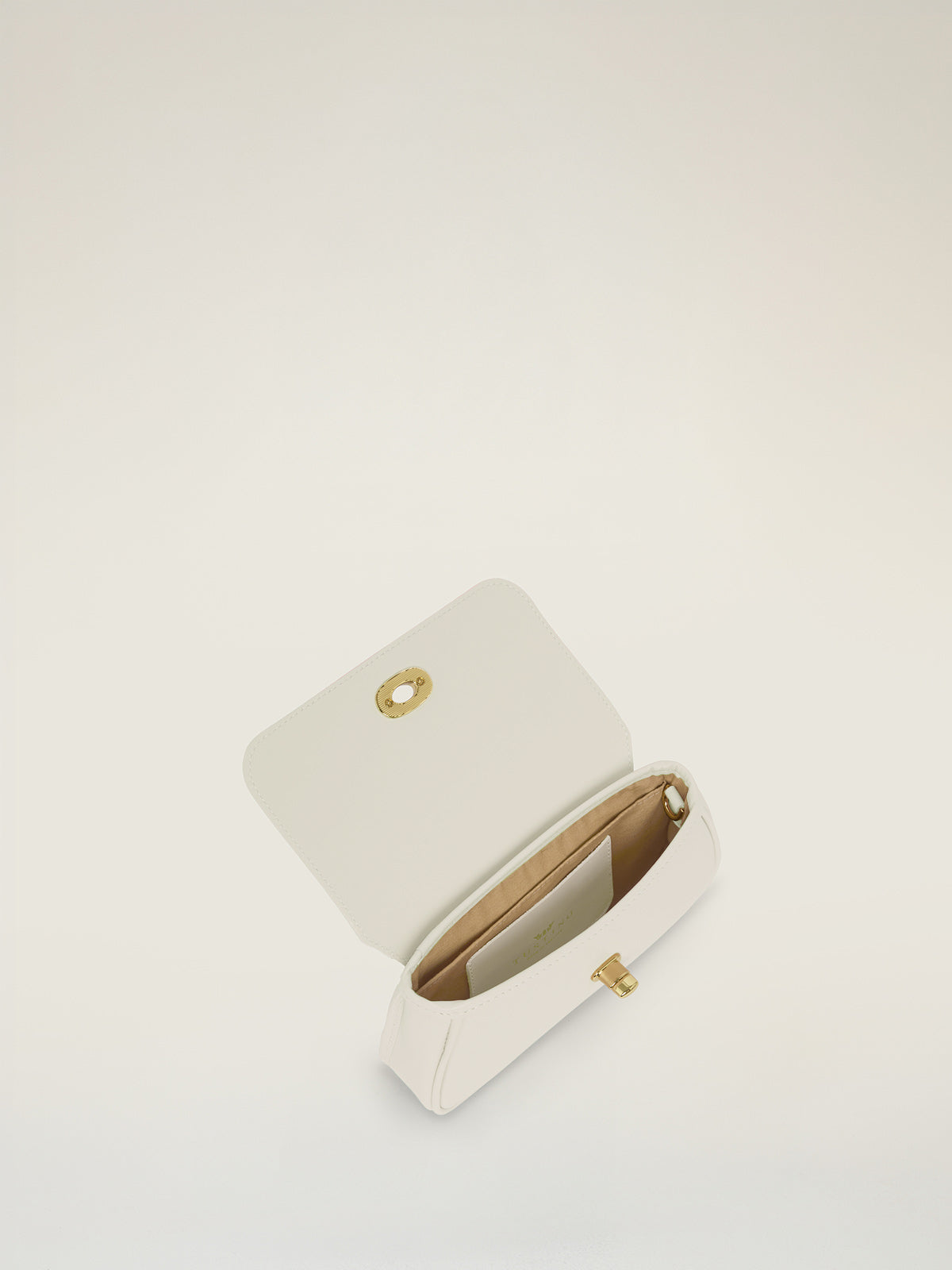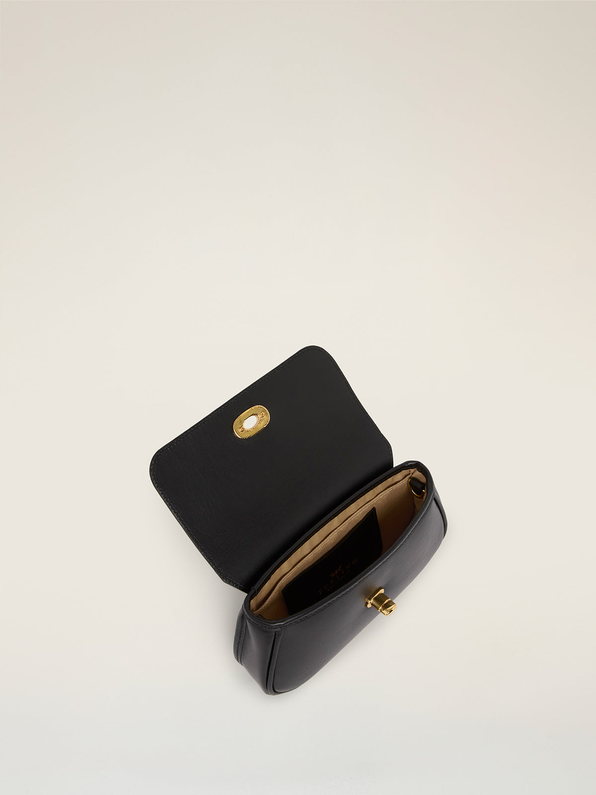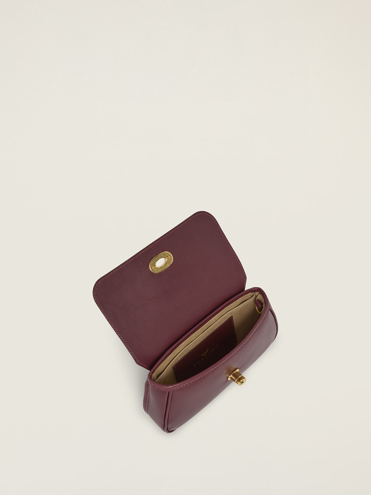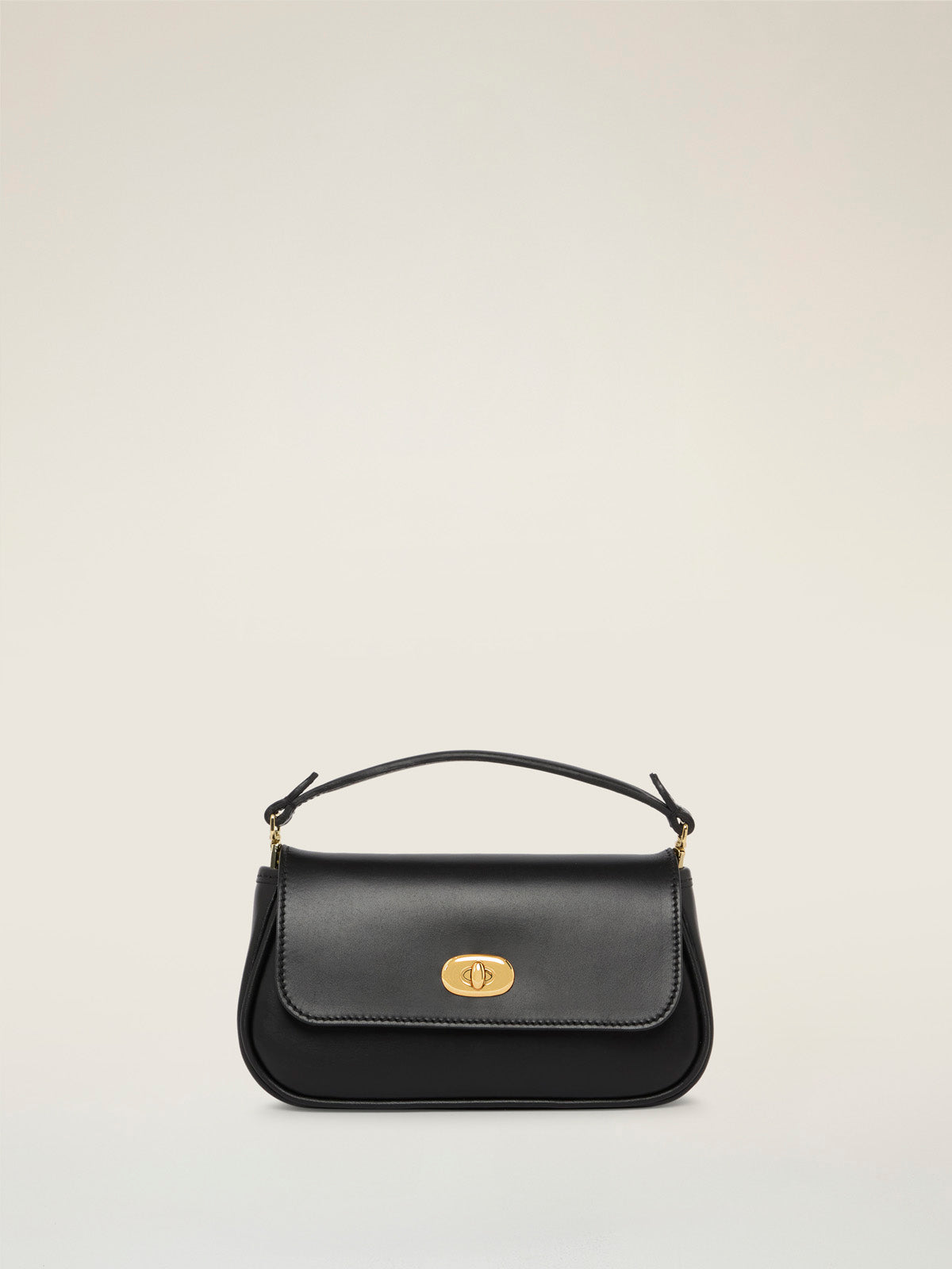 Small day to evening bag in smooth full grain leather or suede, with curved construction and central turn lock. Deceptively capacious and wearable three ways by changing the detachable handle to transform from cross-body to top handle or clutch.