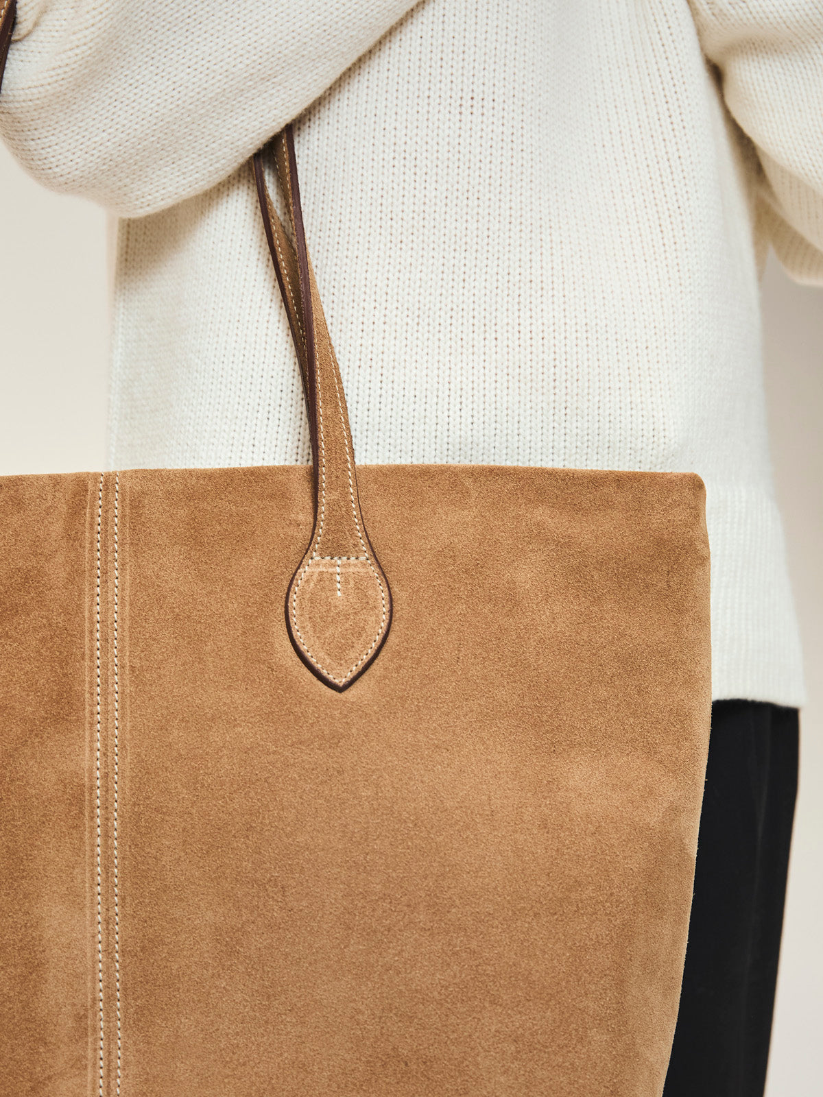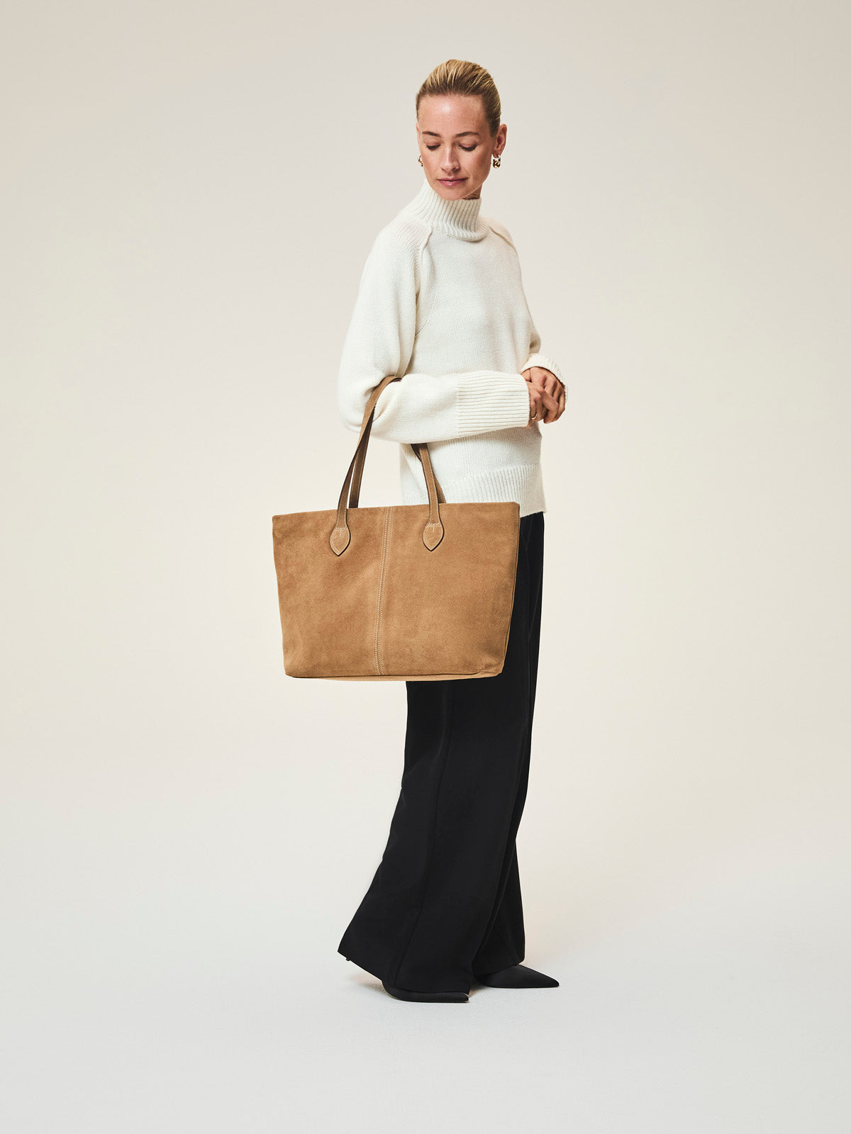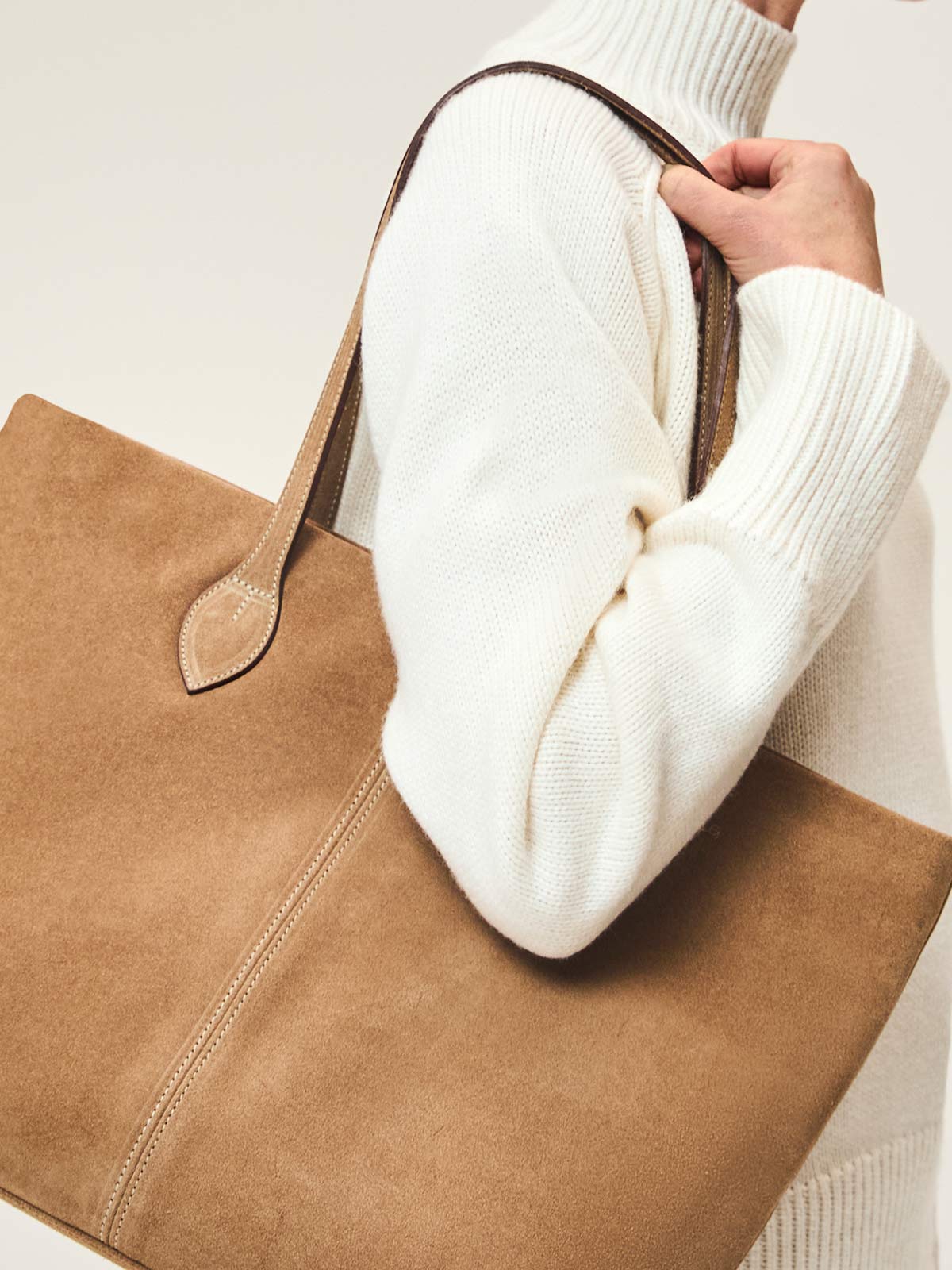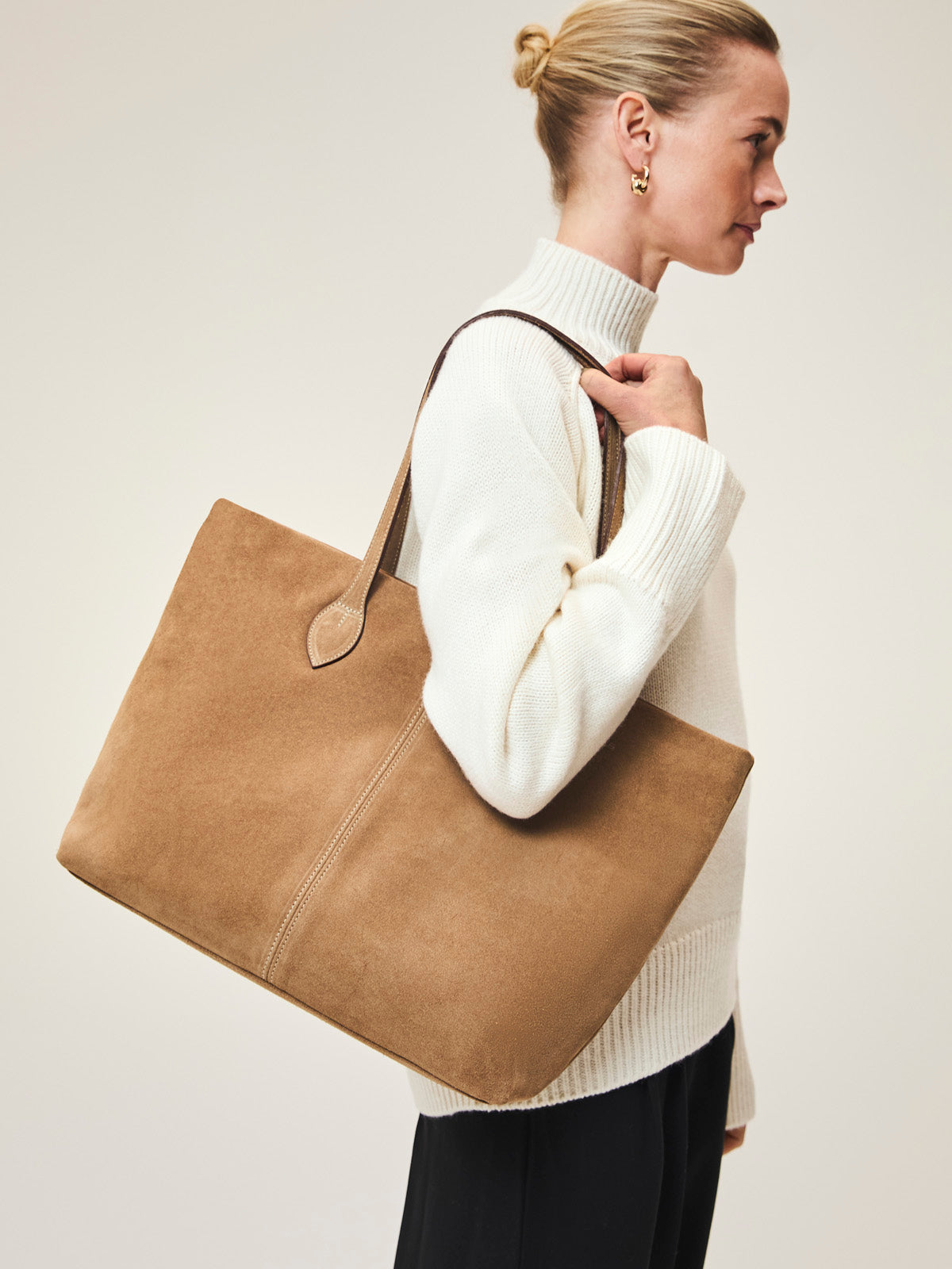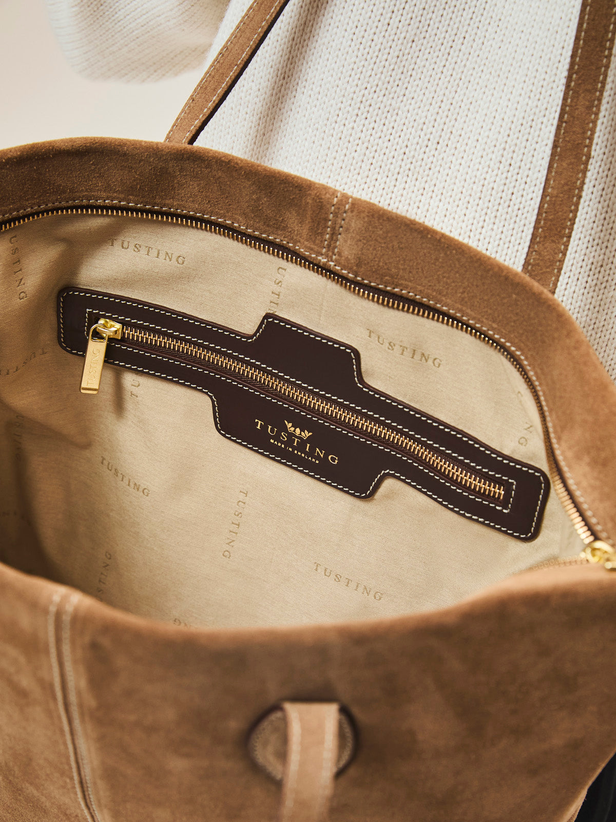 A softly structured piece of generous proportions, the Alice Tote is made from either exquisite Italian suede. Flat shoulder straps are the perfect length for throwing over an arm on the go. Delicate stitching, paired with the gentle slouch of this tote, deliver a look that is relaxed and smart all at once. It features a full lining in Tusting’s signature buff-coloured jacquard with an array of organisational features and a full-width, deep-set zip for security.