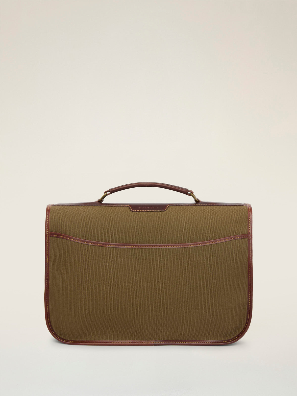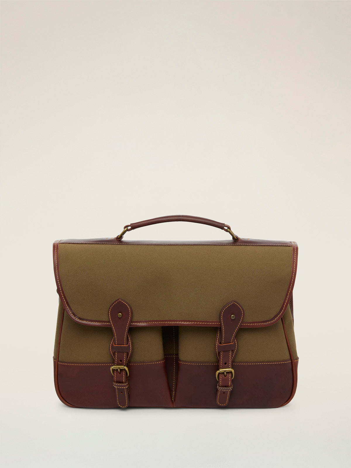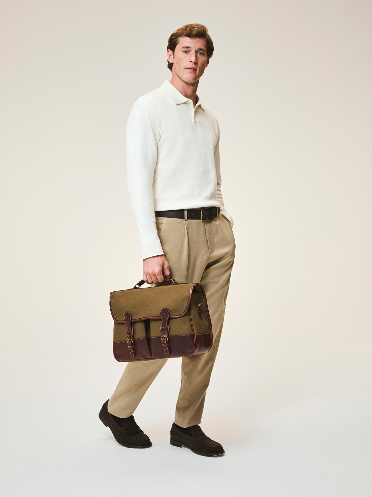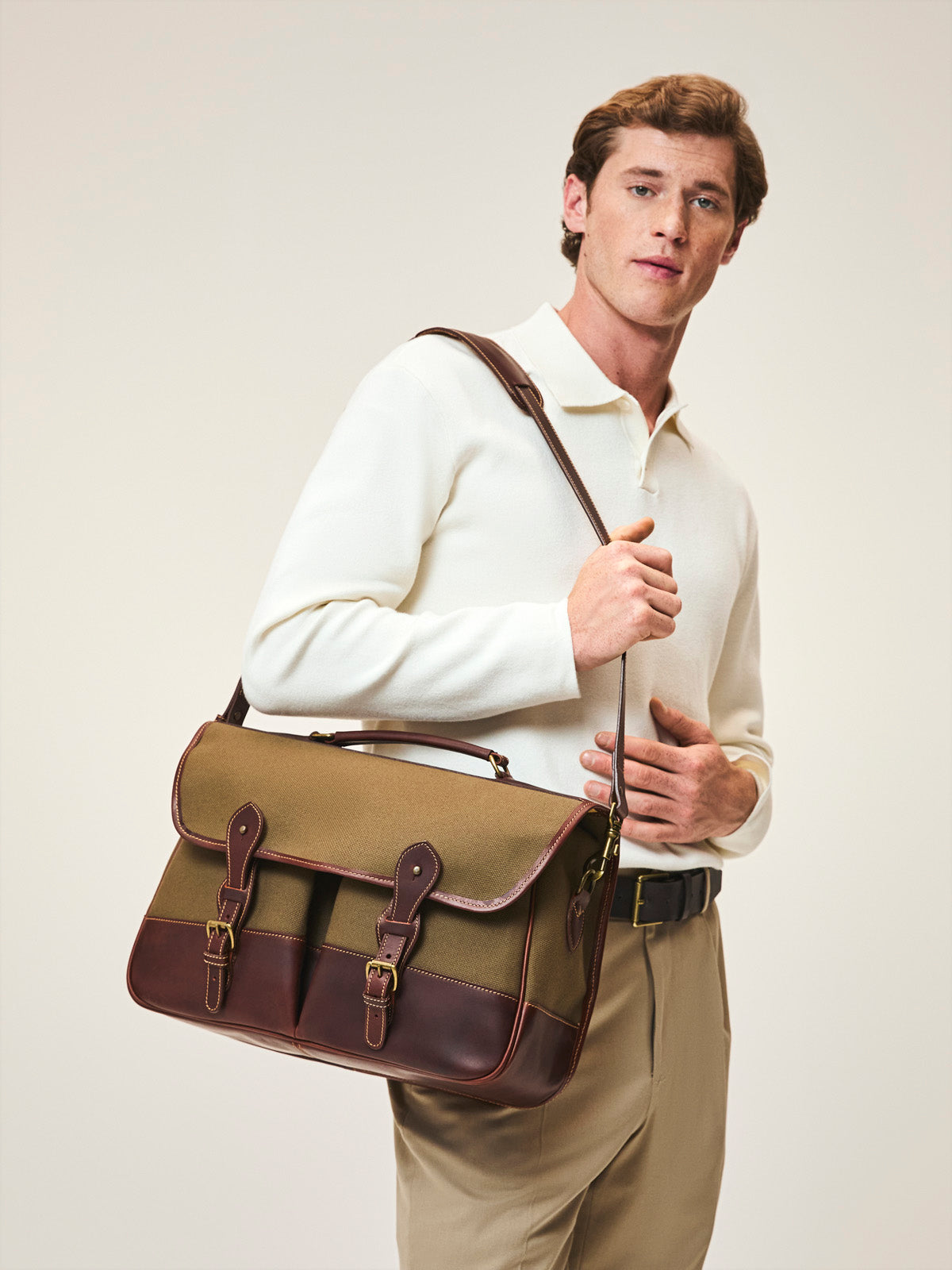 Inspired by a traditional fishing bag, with the addition of a top handle, the clipper becomes a lightweight, informal briefcase. Internal and external pockets allow optimal organisation for your laptop, documents or gym kit. It comes in two sizes to suit a small or large laptop and made with 24oz British canvas and a full grain leather trim, the Clipper is built to last.