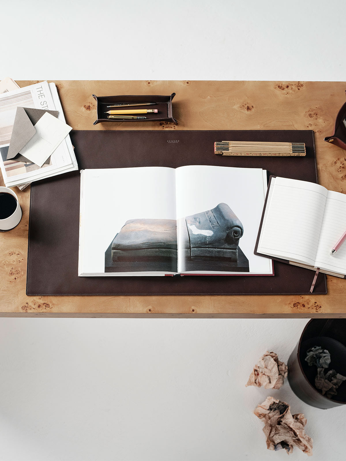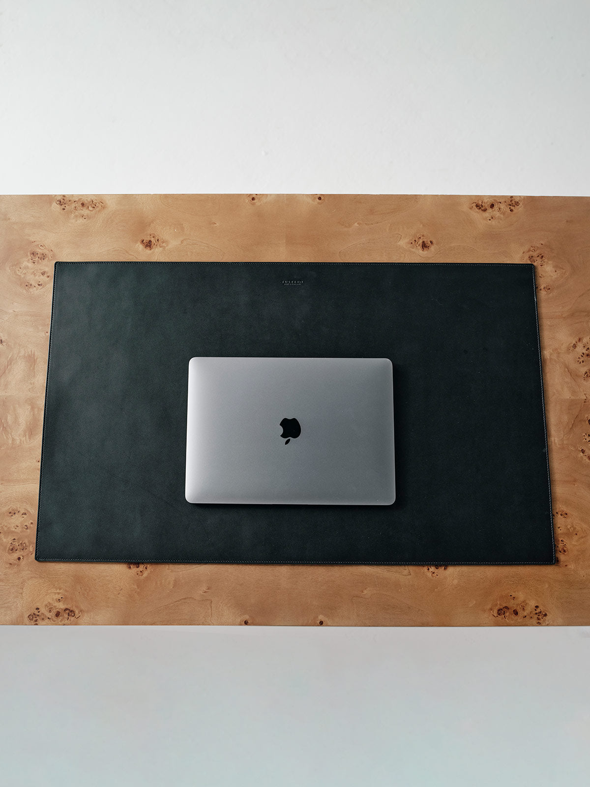 A satisfyingly large and luxurious full-grain leather desk mat designed to provide the perfect balance of cushioning and grip for your desktop key players.