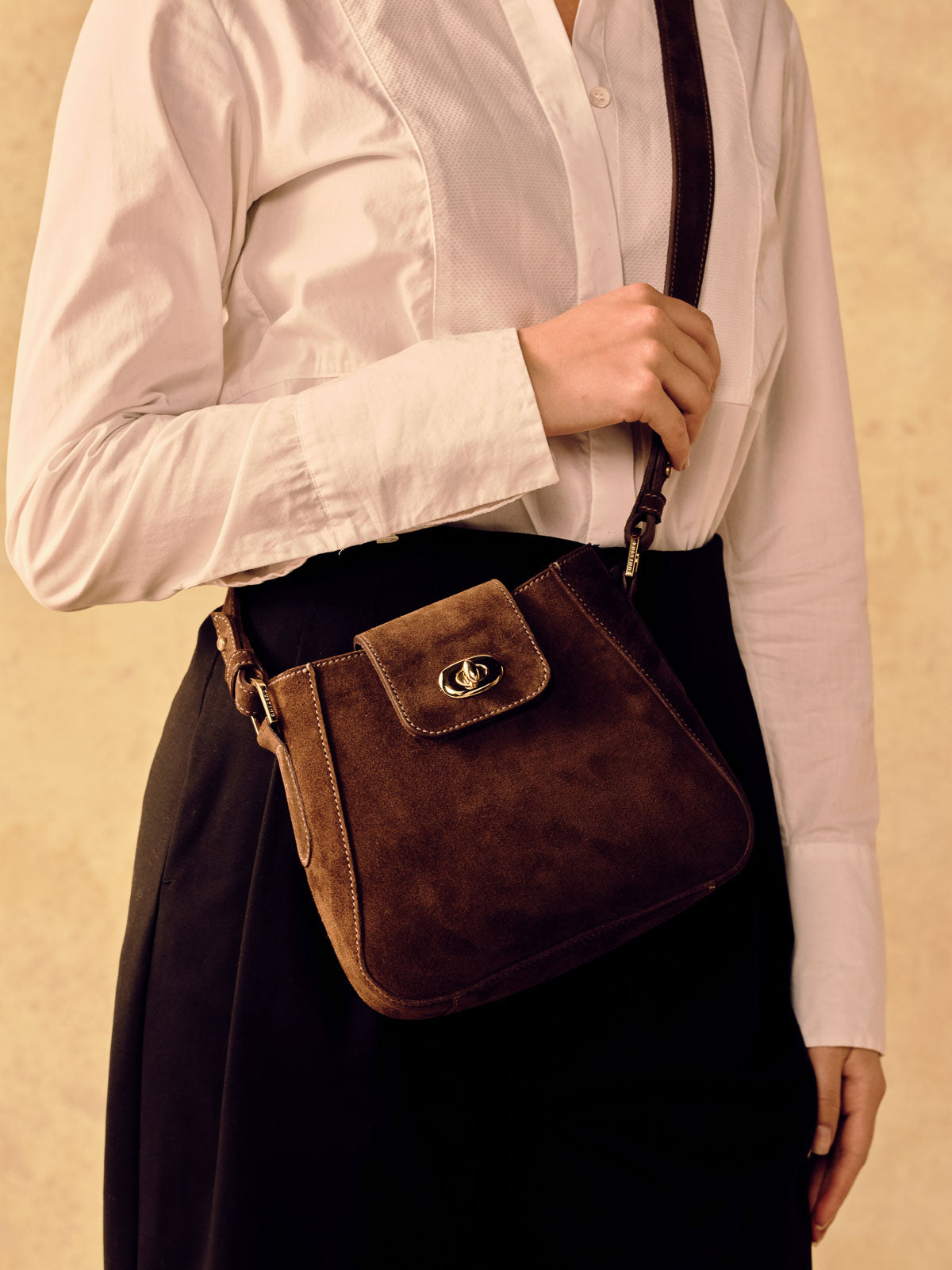 A small-yet-capacious shoulder bag made from smooth full grain leather or soft Italian suede, fully lined in micro suede, the Mini Hazel has a softly-structured, rounded silhouette that sits neatly at hip level when worn as a cross-body, or comfortably chic by the upper arm when worn on the shoulder with the shorter strap. The tapered design and secure turn-lock closure provide ample room for all your daily essentials, and the surprisingly spacious interior includes an additional slip pocket.