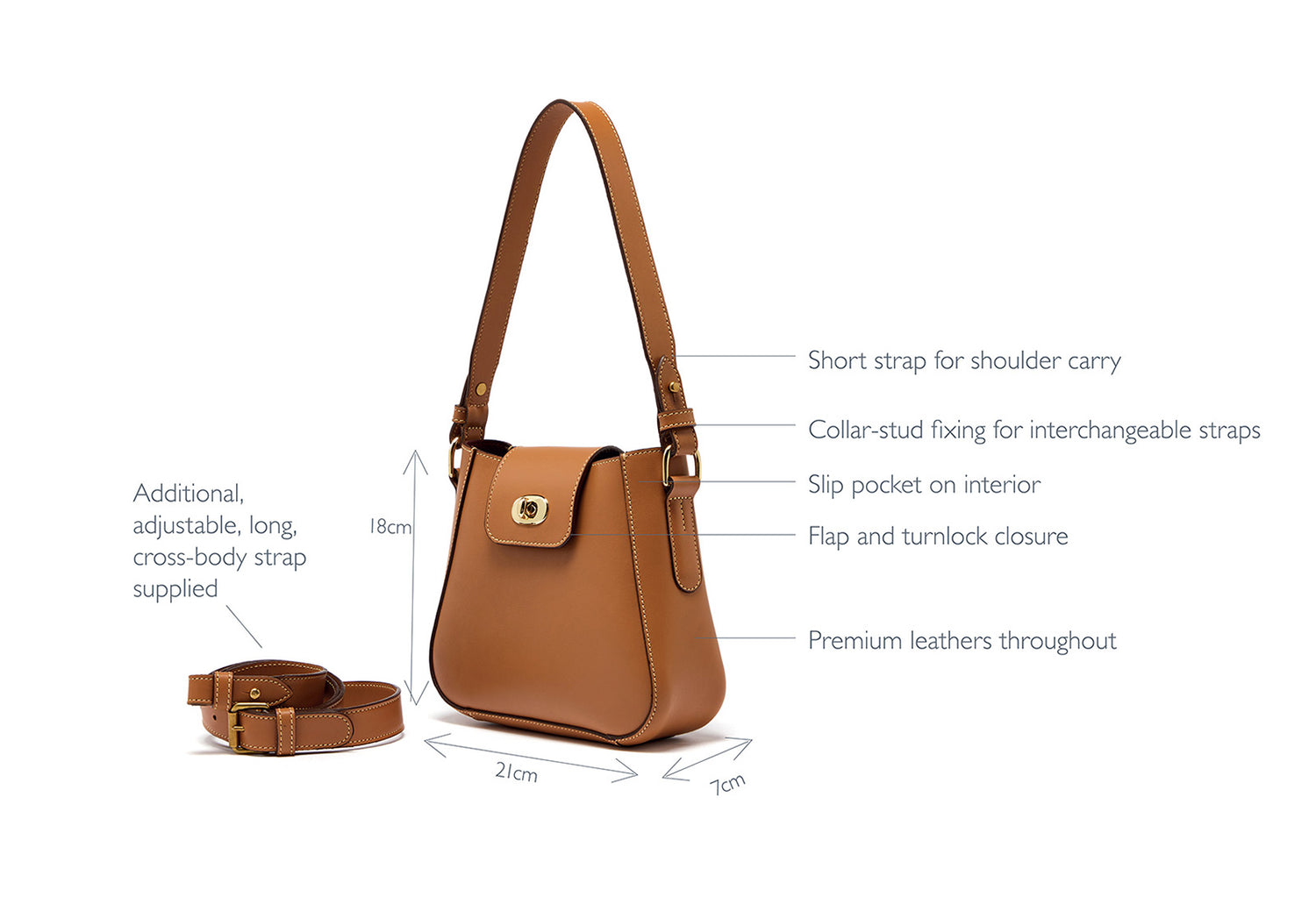 - Supplied with interchangeable straps; adjustable long crossbody strap and a short shoulder strap for two different carry options.