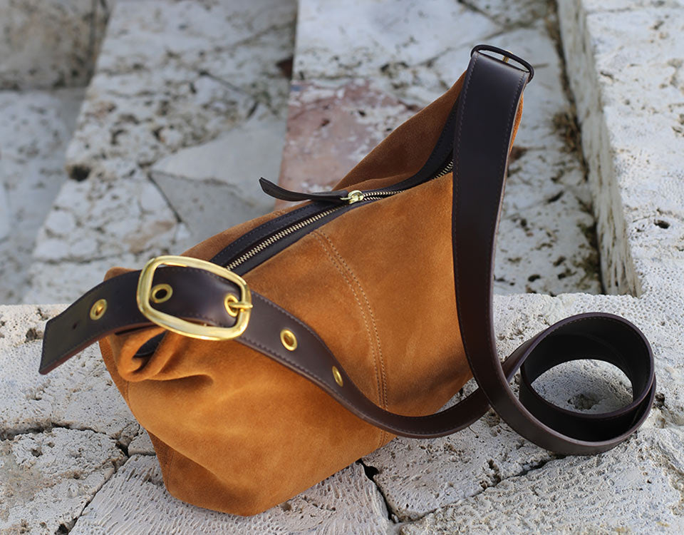An effortlessly stylish daily companion for those on the go. Wear it your way, short strap, long strap or cross-body, the India Hicks + Tusting Rex is meticulously crafted from luxurious caramel suede and trimmed with our Chocolate Montanasoft full-grain leather. The Rex is appropriately adorned with a rich royal purple lining.