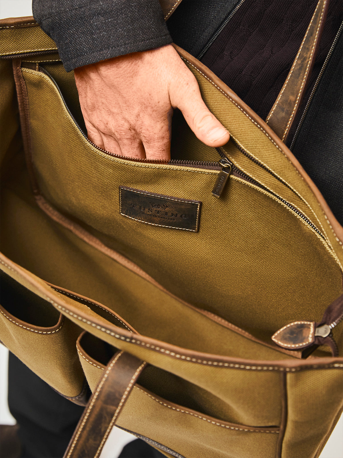 The traditional English look is exemplified by our canvas and leather combination pieces. Our robust cotton canvas is a 24oz fabric that’s custom woven and dyed for TUSTING in Scotland. Protected by a stain-repellent finish, these bags stay looking great however many miles they travel.