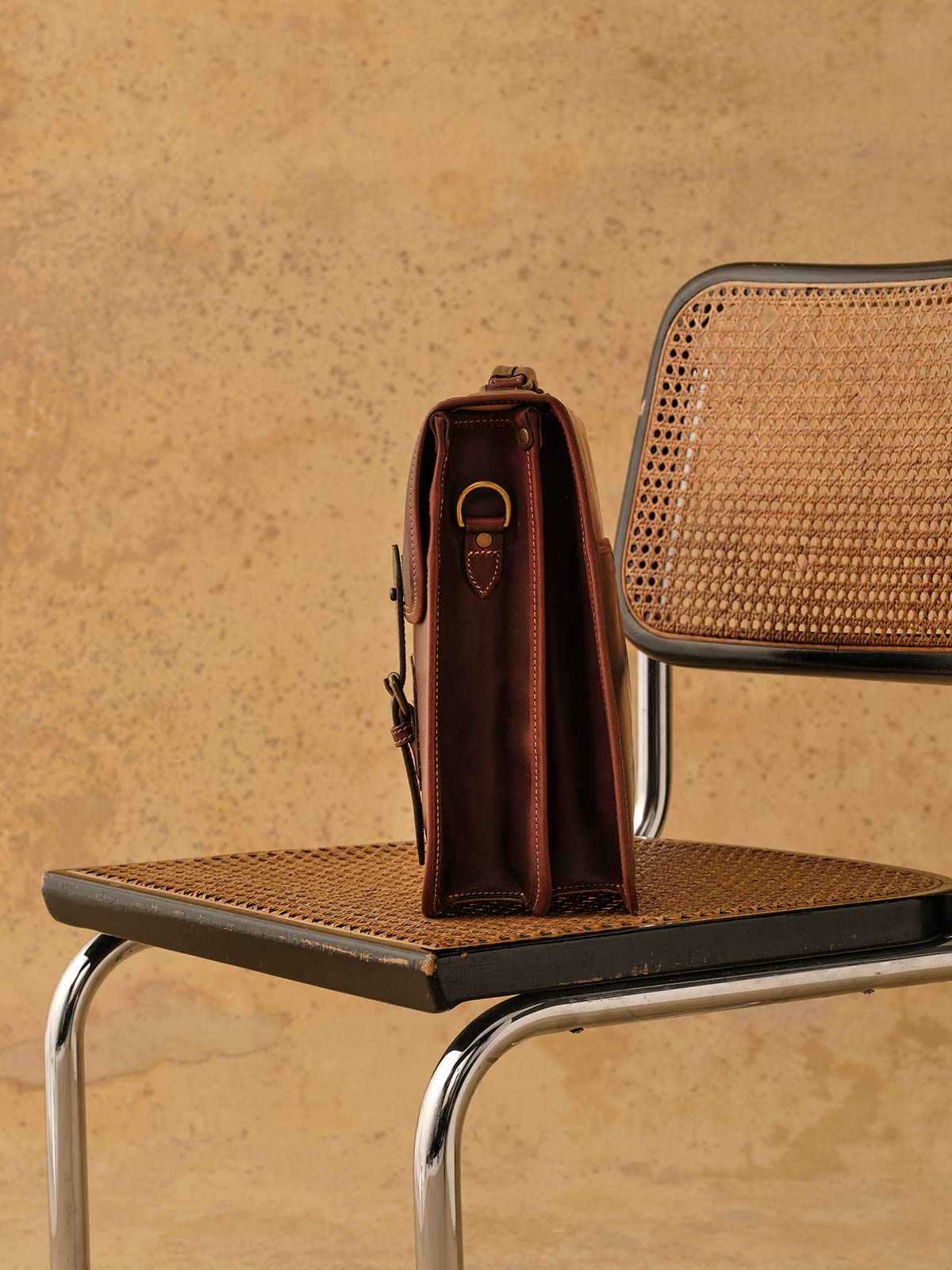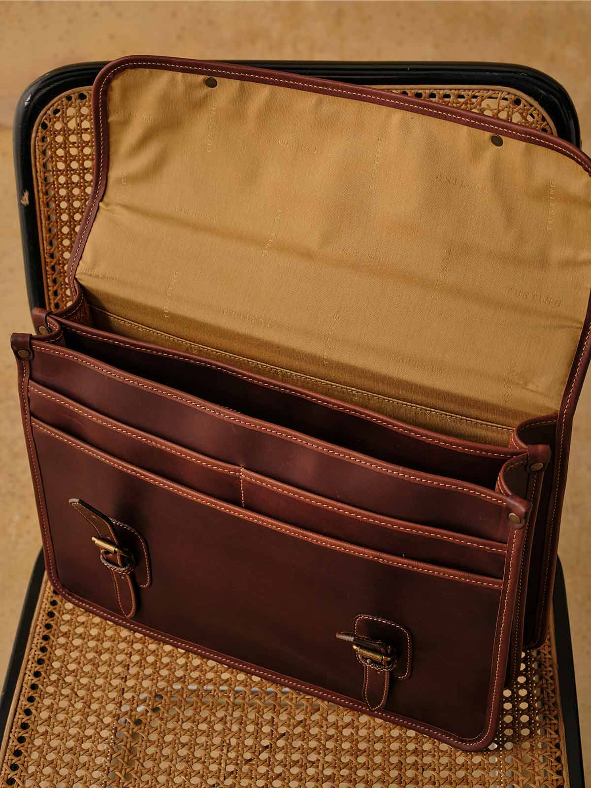 Traditionally styled with modern functionality and internal organisation. Stiffened walls and bound seams allow it to stand independently and maintain shape for years to come. Cleverly designed internal organisation features a padded laptop compartment and an array of pockets for your pens, wallet and notebooks. Made from a choice of two bovine leathers, the Wymington is engineered to be durable whilst maintaining its classic shape, this bag will only get better with use, developing a rich patina over the years.